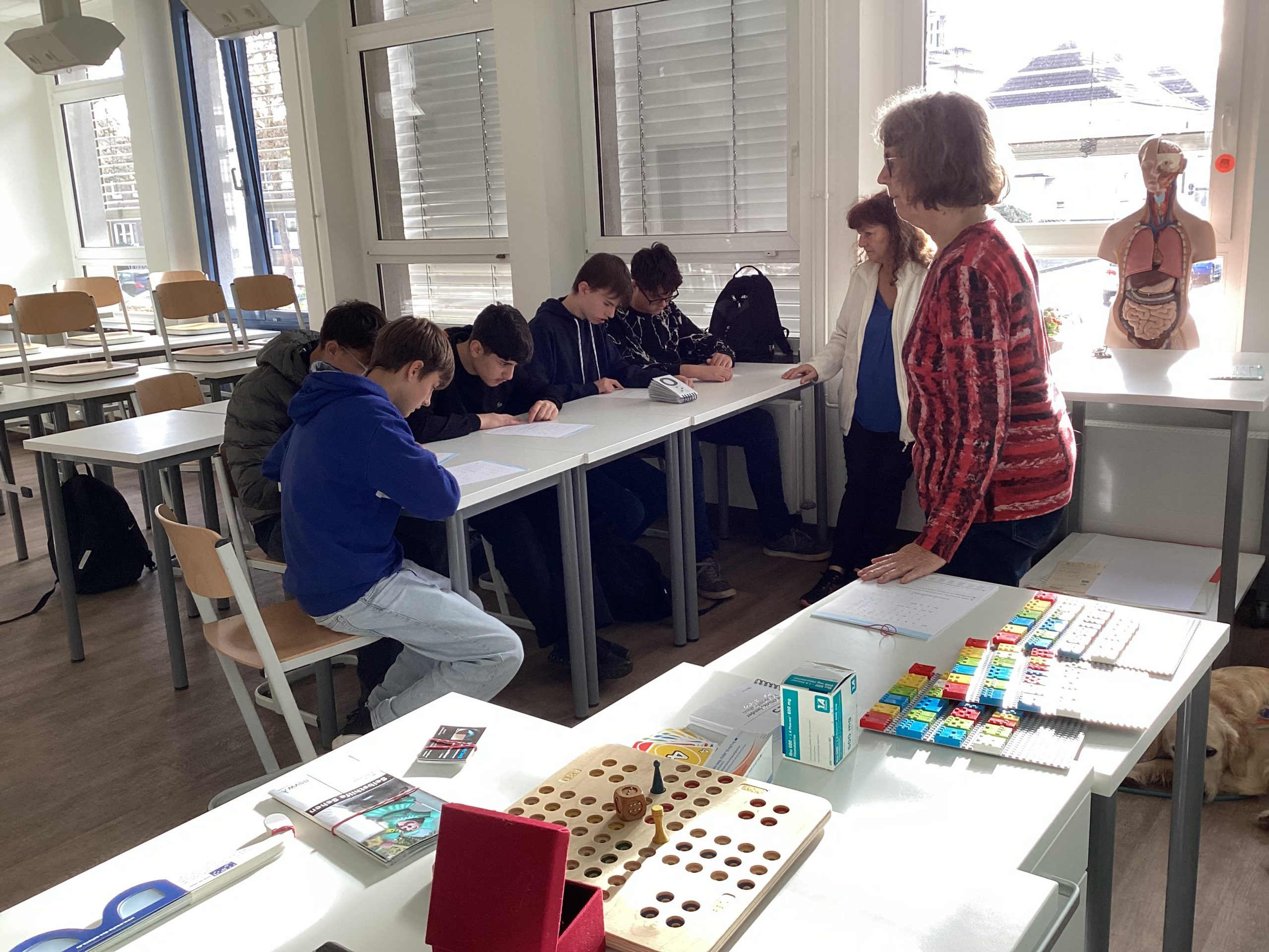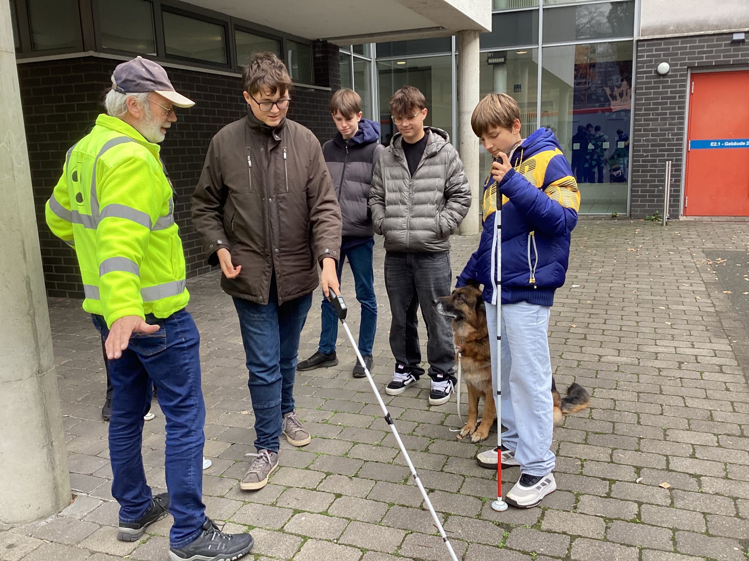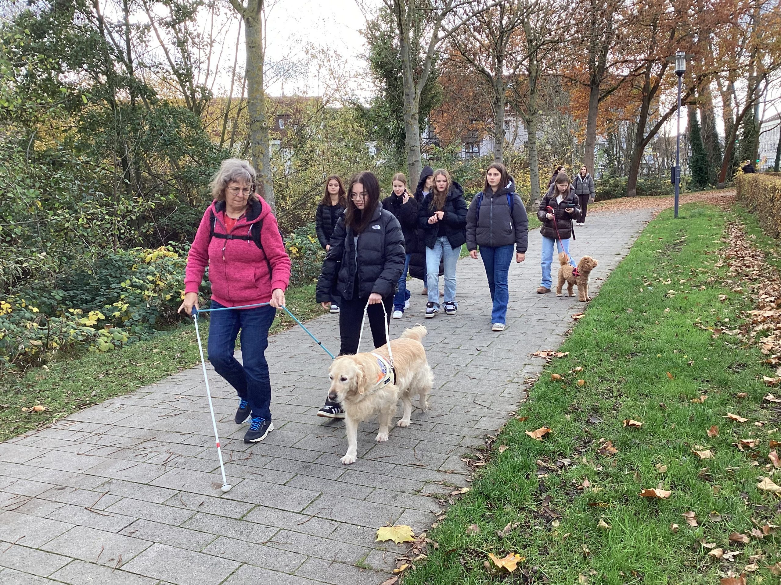 Am 11. November hatte der Wahlpflicht -Kurs Biologie des 9. Jahrgangs Besuch von Ronja und Monty, zwei Blindenführhunden mit ihren Besitzern Brigitte Kriegel und Ludwig Herbort, die von Kursleiterin Sabine Richter eingeladen worden waren. Der Kurs hatte sich intensiv mit dem Sinnesorgan Auge beschäftigt und auch eine Klassenarbeit zu dem Thema geschrieben. Brigitte Kriegel und Ludwig Herbort berichteten sehr offen über ihr Handycap und wie sie ihr Leben damit meistern. In Kleingruppen wurden den SuS Alltagshilfen gezeigt und erklärt. Sie konnten durch Simulationsbrillen einen Eindruck von Blindheit bekommen und eigene Erfahrungen mit der Blindenschrift, dem Langstock und der Führung durch die Blindenhunde machen. Auch Schulhund Melli war immer dabei und hatte Spaß mit den tierischen Besuchern. Nach der Pause konnten alle beobachten, wie sicher die Hunde nach jahrelanger Ausbildung ihre Besitzer durch die Stadt führen, vorbei an Hindernissen, über Treppen, Straßen, Ampeln, zu Bänken und zum Park, wo man sich das Lippstadtmodell gemeinsam anschaute und erfühlte. Am Bahnhof schließlich verabschiedeten sich alle sehr herzlich voneinander nach einem sehr bereichernden Vormittag!