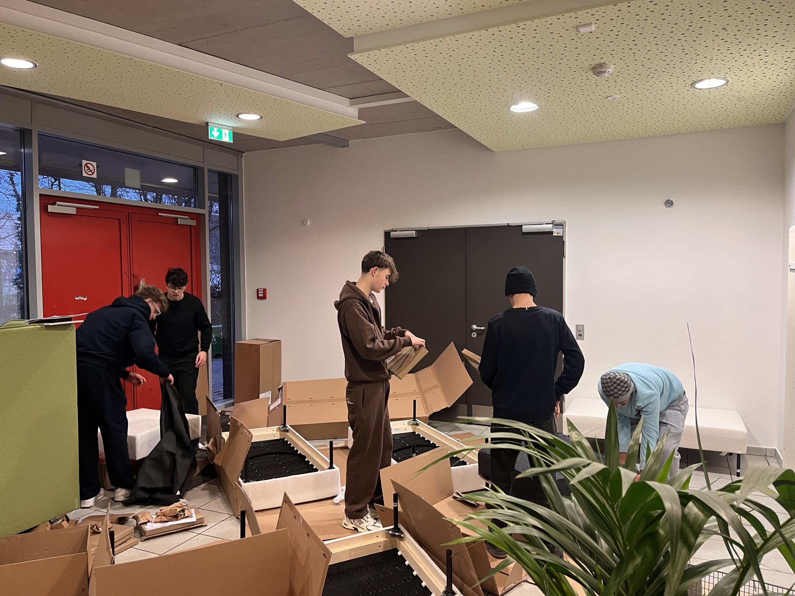 Nach einer Phase intensiver Planung erstrahlt der 10er-Raum nun in neuem Glanz. Frische Farben, bequeme Möbel und zahlreiche Pflanzen haben einen Ort geschaffen, der zum Wohlfühlen und Verweilen einlädt. Auf gemütlichen Sofas können die Schülerinnen und Schüler ihre Pausen entspannt verbringen und neue Energie tanken. Ein besonderer Dank gilt den Schülerinnen und Schülern des Jahrgangs 10 sowie Frau Weber, Herrn Siering und Herrn Hillemeier, die die Renovierung mit großem Engagement unterstützt haben. Die Schülerinnen und Schüler waren nicht nur beim Aufbau tatkräftig beteiligt, sondern tragen auch Verantwortung dafür, dass der Raum weiterhin so schön und einladend bleibt.