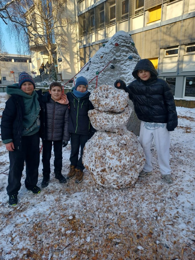In den letzten Tag gab es ganz schön viel Schnee. Das nahmen gestern einige Schüler aus den 6. Klassen zum Anlass, um in der Pause einen Schneemann zu bauen. Ruckzuck rollten sie drei Kugeln durch den Rindenmulchbereich am Kletterstein und bauten sie aufeinander. Tolle Aktion – auch als gern gesehene Alternative zum gefährlichen Schneeballwerfen.