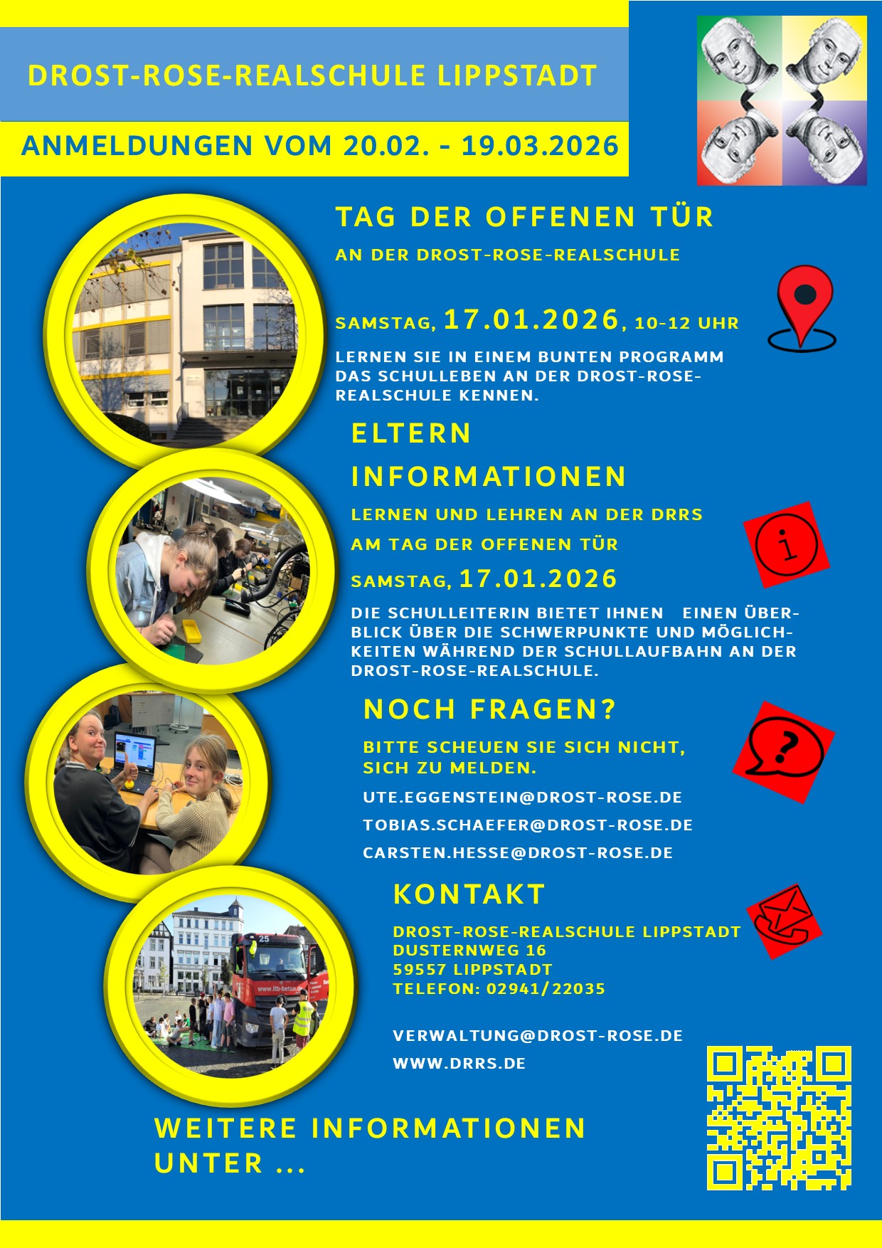 Bei von SchülerInnen und Schülern geführten Rundgängen durch das Schulgebäude wird ein Überblick über die Schwerpunkte und Möglichkeiten an der Drost-Rose-Realschule vermittelt. Dabei werden Einblicke in die neuen naturwissenschaftlichen Räume, das digitale Lernen in verschiedenen Fächern und die Möglichkeiten der individuellen Förderung gegeben. Einzelne Fachbereiche stellen Inhalte des Lernens im Unterricht vor.